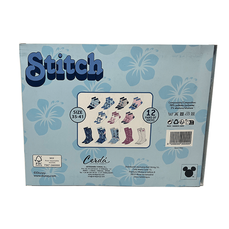 Presentado en un calendario de adviento decorado con gráficos festivos y detalles tropicales inspirados en Stitch. Cada compartimento oculta un par de calcetines, haciendo que abrirlo día a día sea una experiencia emocionante y divertida.