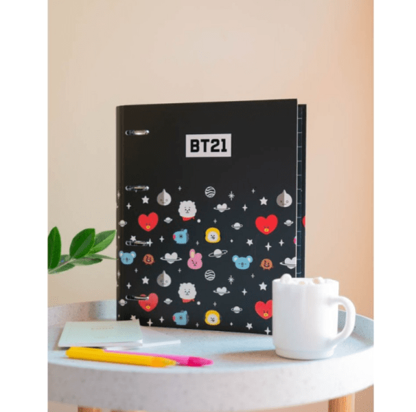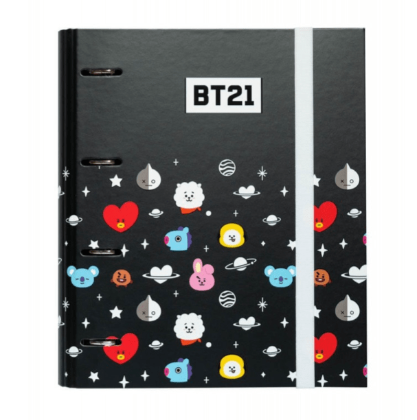 Esta carpeta 4 anillas PREMIUM BT21 es genial para organizar tus documentos. La mejor forma de organizar cualquier documento son las carpetas de anillas. Fabricadas con materiales de alta calidad y los diseños y licencias más actuales. Elaboradas con tapa dura de cartón de 2 mm de espesor y forradas con papel laminado en mate y detalles en foil stamp. Tienen un tamaño de 26×32 cm, encuadernación de 4 anillas, cierre con banda elástica de 9 mm y diseño interior personalizado.Es un regalo original para cualquier fan de BTS y la moda kawaii.