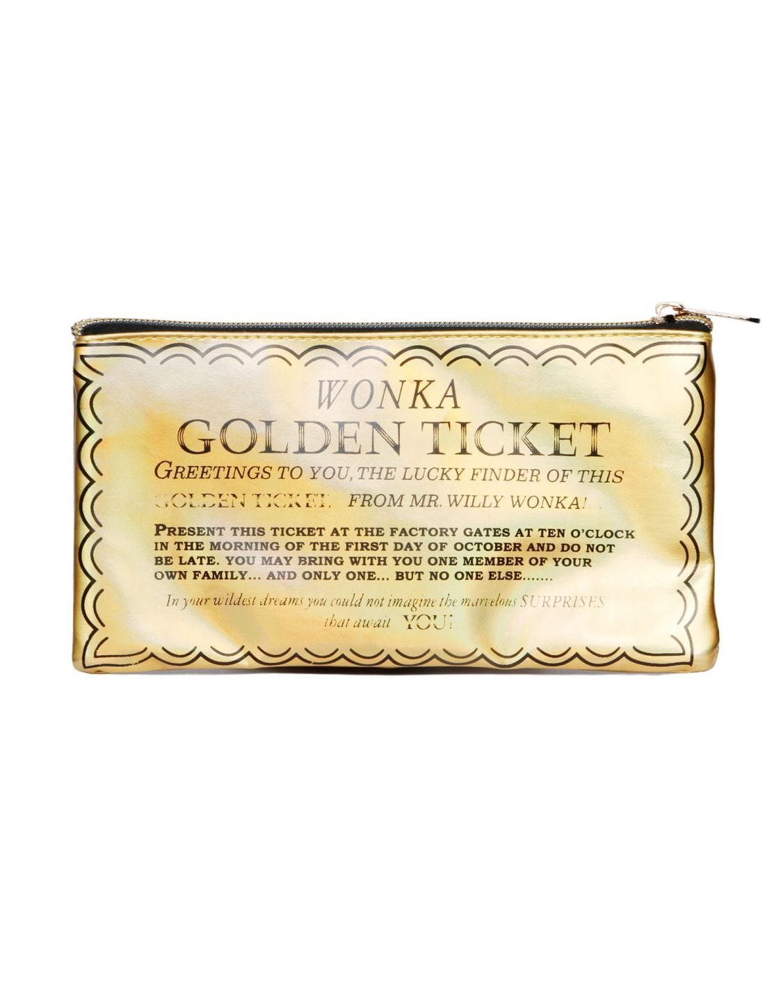 Con este Neceser Charlie y la Fábrica de Chocolate Ticket Wonka tendrás un regalo único y original. Imita el Ticket Dorado de Willy Wonka en la película de Tim Burton. Tiene licencia oficial de Disney y está realizada en cuero sintético, sin usar ningún material procedente de animales en su fabricación.