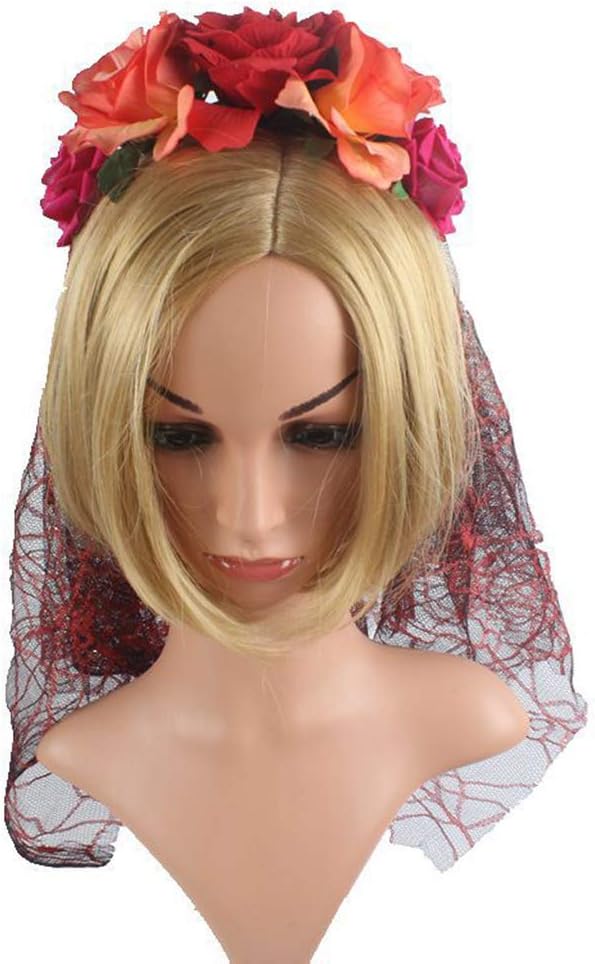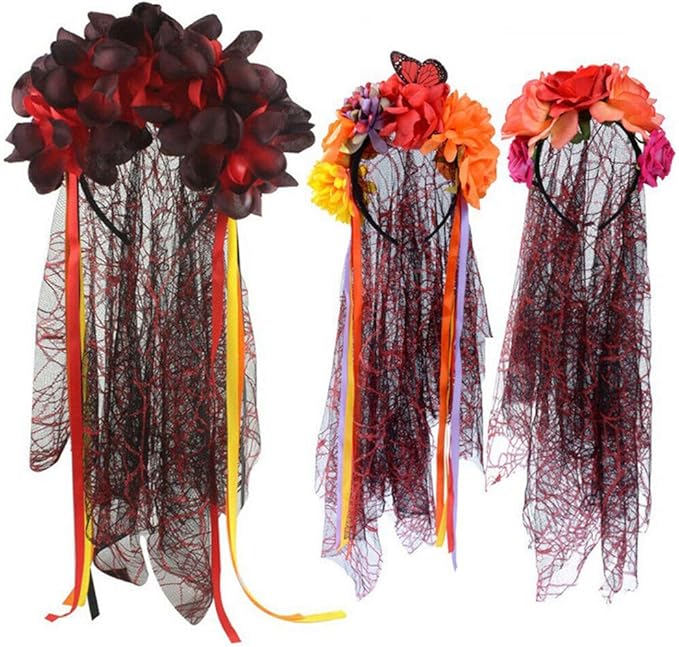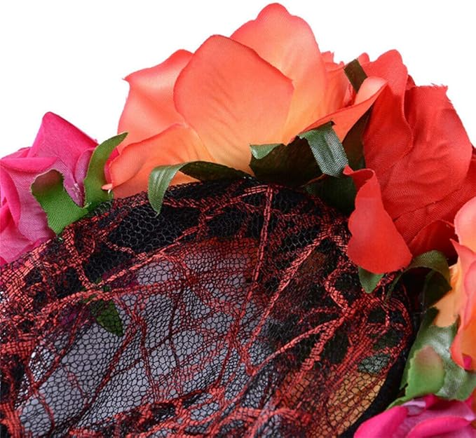 Flores de tela de colores en la diadema y un velo largo de malla debajo de las flores para el disfraz de Halloween Día de los Muertos de Catrina/Calavera de Azúcar.