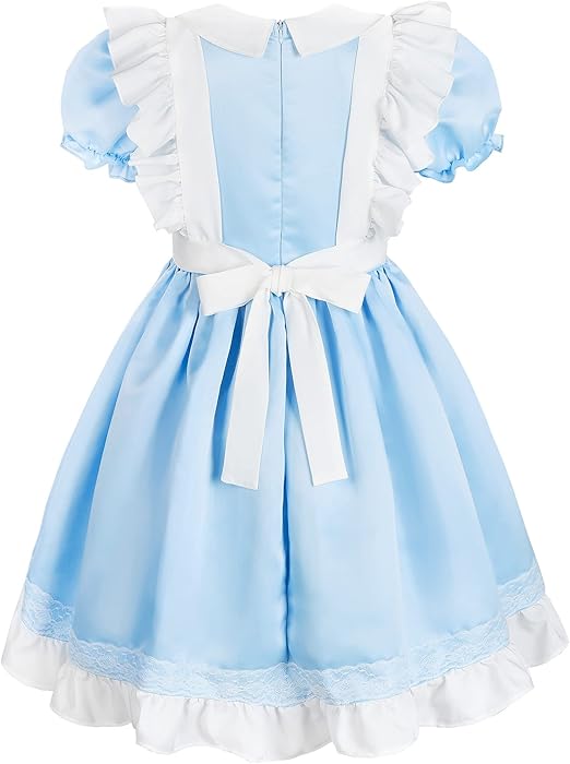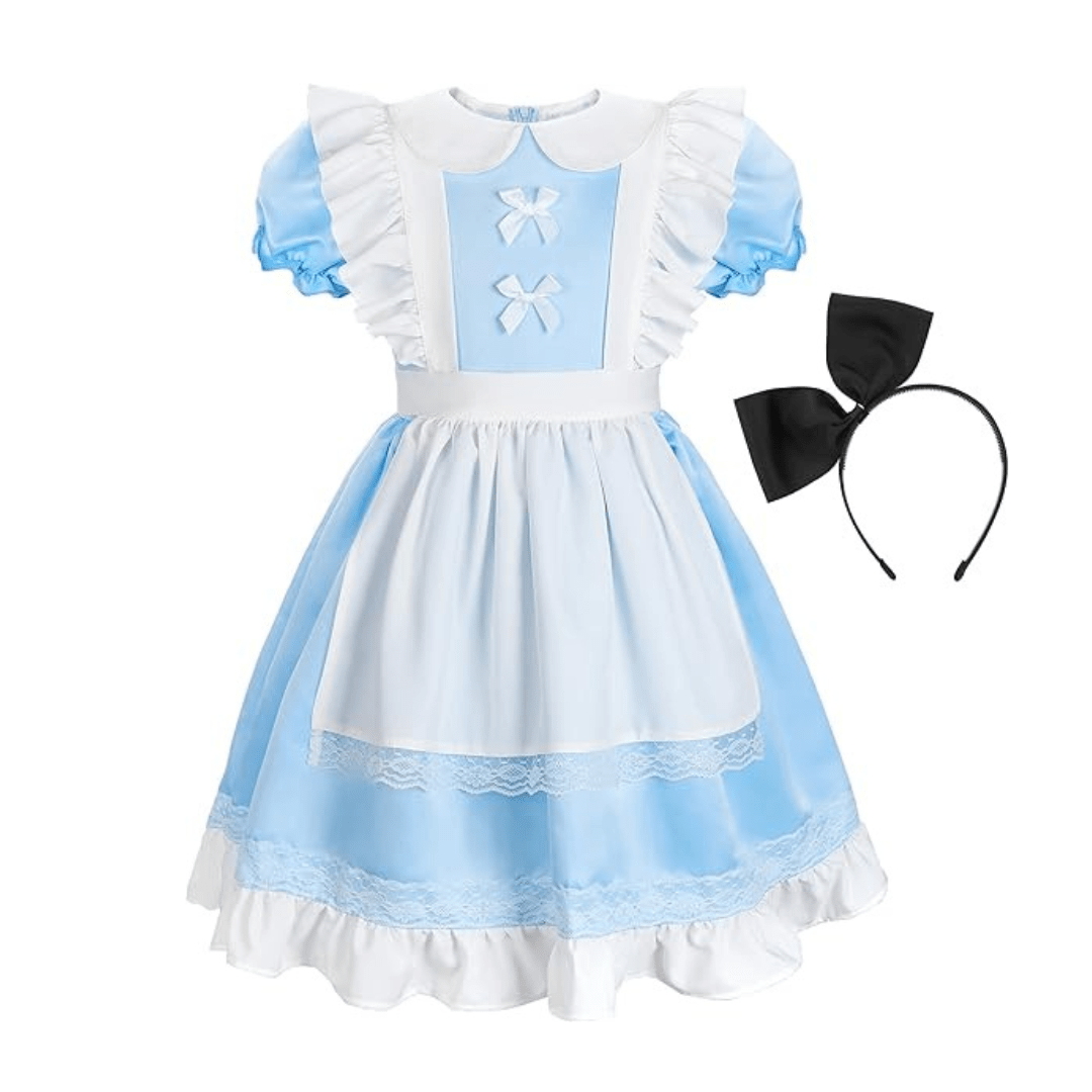 Incluye un vestido azul con falda de vuelo, un delantal blanco con detalles encantadores y un lazo para el cabello, recreando fielmente el estilo de Alicia. Está confeccionado con materiales cómodos y ligeros, permitiendo total libertad de movimiento. Disponible en tallas para niñas de 3 a 12 años. El paquete incluye: Un vestido + una Banda capilar