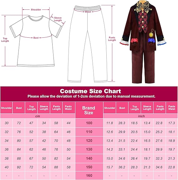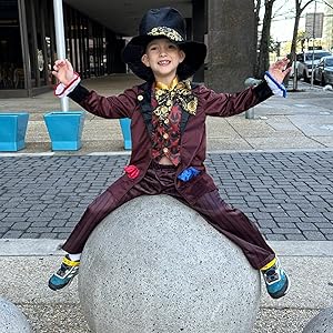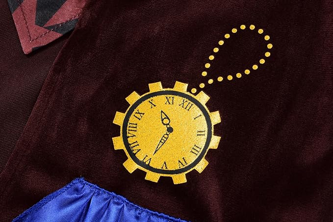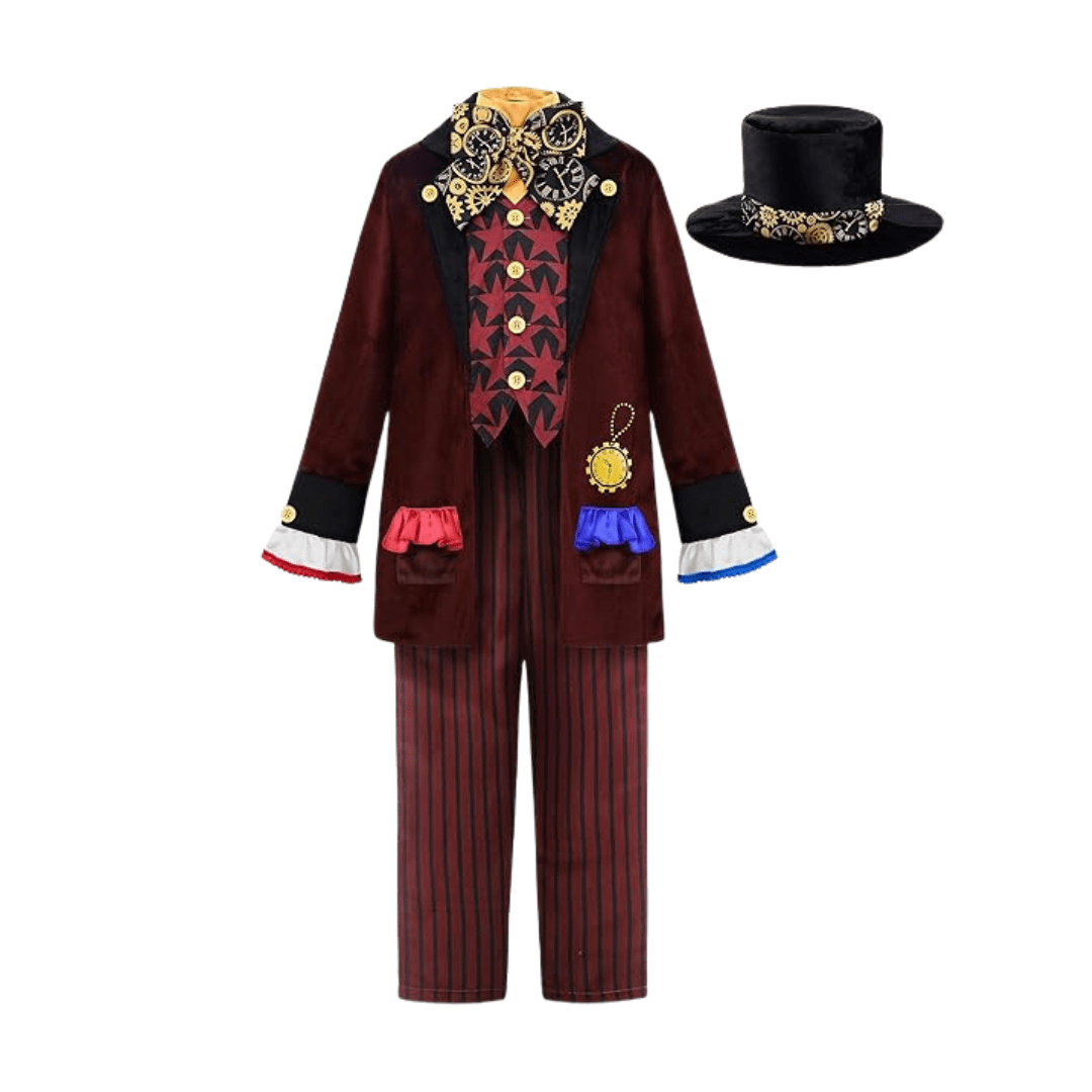 Incluye una chaqueta llamativa con detalles únicos, un chaleco a juego, una pajarita extravagante y el icónico sombrero de copa decorado, capturando a la perfección el estilo del Sombrerero Loco. Fabricado con materiales cómodos y resistentes, está disponible en tallas para niños de 3 a 12 años. ¡Atrévete a entrar en el mundo de las maravillas y diviértete como el personaje más alocado de la historia!