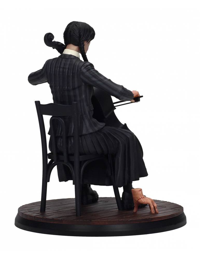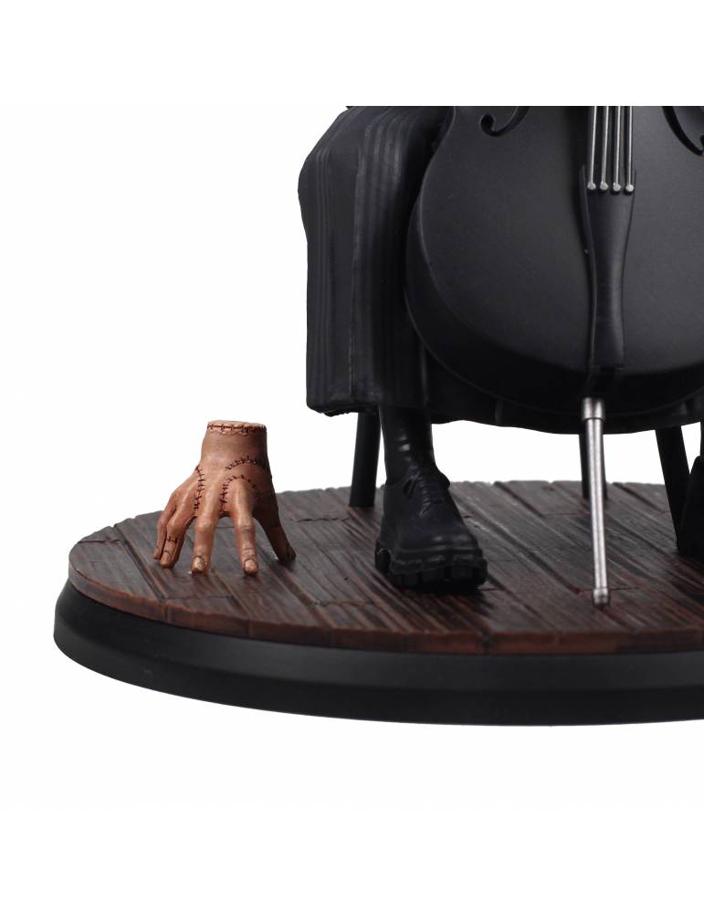 Fabricada en PVC de alta calidad, esta pieza destaca por su esculpido preciso y el pintado a mano que realza cada detalle: desde el inconfundible vestido negro con camisa blanca hasta las cuerdas y arco del instrumento. La expresión concentrada del personaje y la fidelidad al diseño original la convierten en un imprescindible para fans y coleccionistas de The Addams Family.