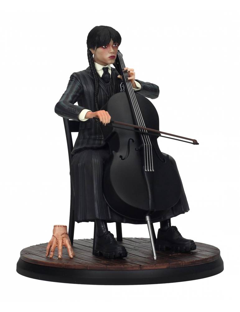 Revive uno de los momentos más memorables de la serie Miércoles con esta figura coleccionable de SD Toys. Con una altura aproximada de 15 cm, representa a la carismática y enigmática Miércoles Addams interpretando el violonchelo, acompañada por la inseparable Cosa sobre una base texturizada que imita madera.