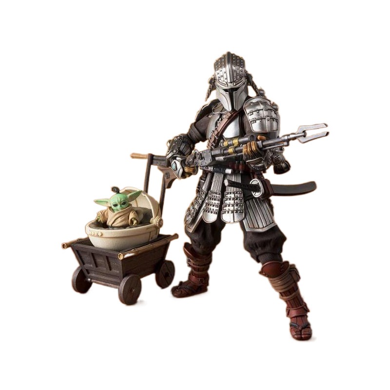 Este conjunto de figuras tan especial forma parte de la serie MEISHO MOVIE REALIZATION, que reproduce a algunos de los personajes principales del universo Star Wars, pero con un aspecto algo distinto, como si estuvieran en el Japón Feudal. Una versión muy especial de Din Djarin, vestido con la Beskar Armor, que viene junto a nuestro adorable y querido Baby Yoda, cuyo carrito tiene un aspecto rediseñado para la ocasión. Tanto la cantidad de detalles como los acabados son absolutamente espectacular. Además, viene con una gran cantidad de accesorios: 2x pares de manos intercambiables, 1x rifle, 1x Jet pack, 1x pistola blaster, 1x espada y 1x vaina. La figura de Din Djarin es articulada y mide unos 18,5 cm, mientras que la de Grogu mide 3,5 cm y viene junto a su carrito. Una figura de colección que ningún amante de la saga o coleccionista podría dejar escapar y, como no, un regalo inolvidable para los fans de The Mandalorian y el universo Star Wars. Podéis mirar más productos de The Mandalorian aquí.