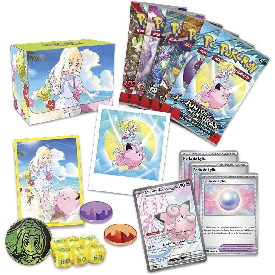 Contenido: 1 carta holográfica de promoción con ilustración expandida de Clefairy ex de Lylia y 3 cartas holográficas de Herramienta Pokémon de Perla de Lylia. 65 fundas para cartas Lydia. 1 robusta caja para cartas Lydia. 1 moneda de gran tamaño de Lydia. 6 sobres de mejora de JCC Pokémon seleccionados al azar, 2 marcadores de condición y 6 dados a modo de contadores de daño aptos para torneos. (Cada sobre de mejora contiene 10 cartas más una Energía Básica. Las cartas varían en función del sobre). Idioma: Español. Edad: +6 años.