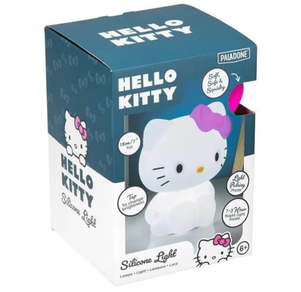 Está fabricada en silicona y cuenta con un tacto suave y un diseño 3D con la forma del icónico personaje. Mide aproximadamente 18 centímetros de altura. Incluye un interruptor de encendido/apagado en la base. Funciona con una batería interna recargable que se carga por USB (no incluido). Ideal para dormitorios, oficinas o rincones kawaii. Regalo perfecto para fans de Hello Kitty y amantes de lo cute.
