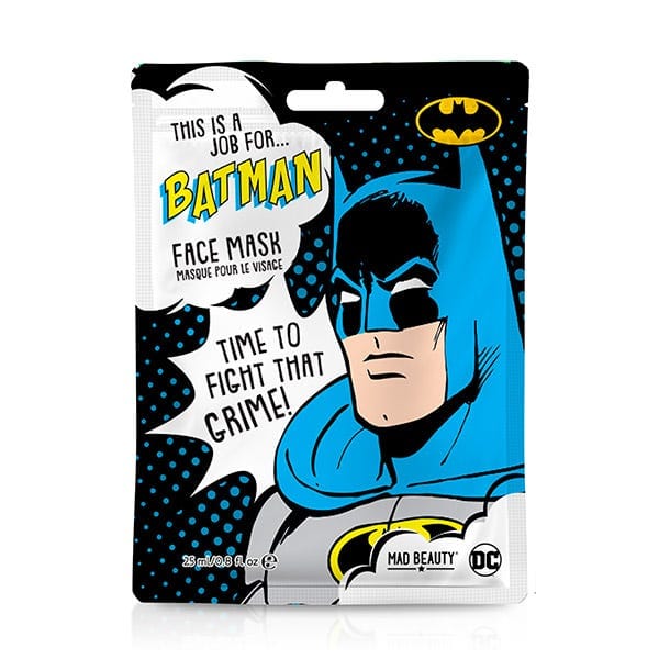 Mascarilla Facial de Batman «This is a Job for batman» con superpoderes de refrescar e hidratar tu rostro. Esta mascarilla tiene impresa la cara del personaje, y con aroma de té negro.  Para todas las que aman a Batman tanto como catwoman lo hace. Es de la marca MAD BEAUTY. No testado en animales (Cruelty free). Para todo tipo de pieles.