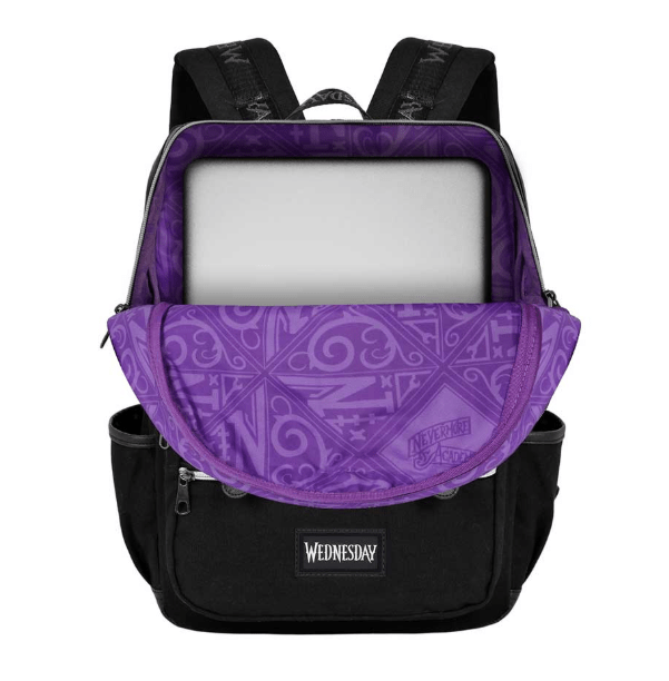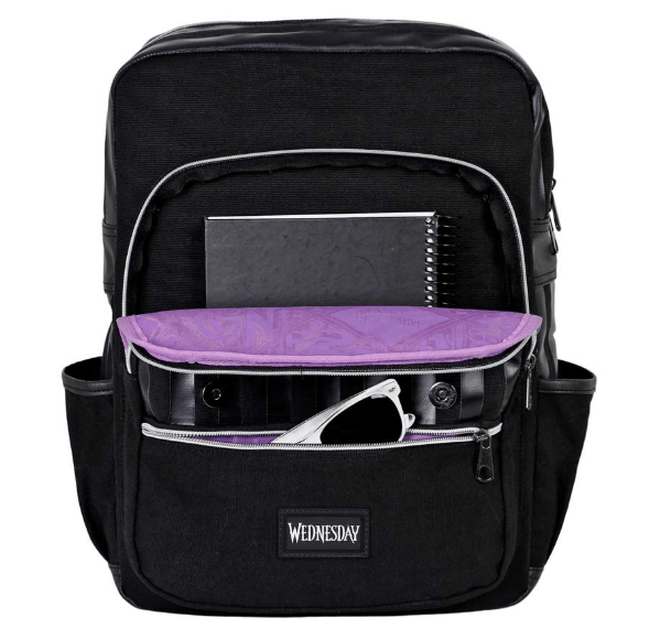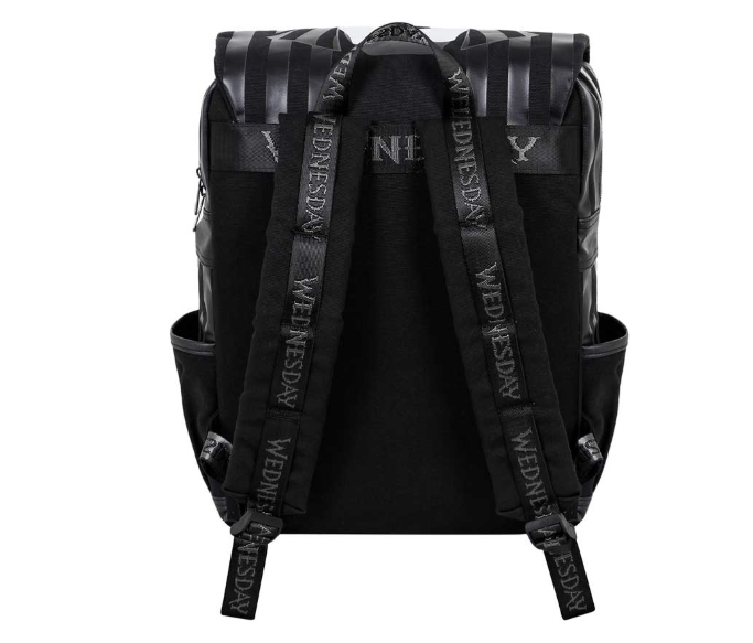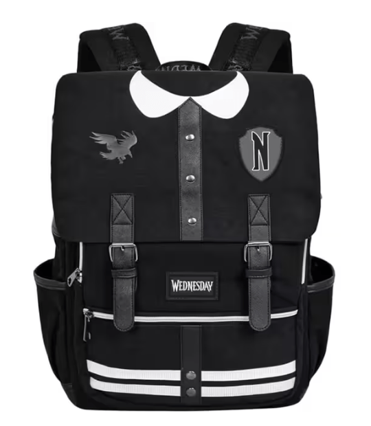 Exprésate con la actitud inconfundible de Wednesday Addams gracias a esta mochila Varsity de 40 cm, de inspiración retro que combina estilo vintage con un toque oscuro y moderno. Inspirada en las clásicas mochilas universitarias, pero con ese sello gótico único que solo Miércoles sabe llevar.