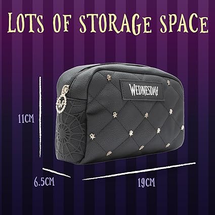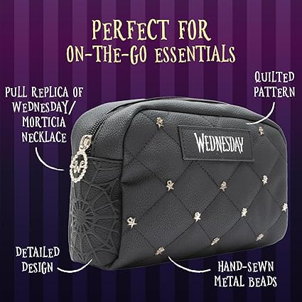 Lleva contigo el misterio y la elegancia de Wednesday Addams hasta en tu rutina de belleza con este neceser acolchado de Blue Sky. Compacto pero sorprendentemente espacioso, es el refugio perfecto para tus productos de maquillaje y accesorios, manteniéndolos organizados y protegidos con estilo gótico y sofisticado.