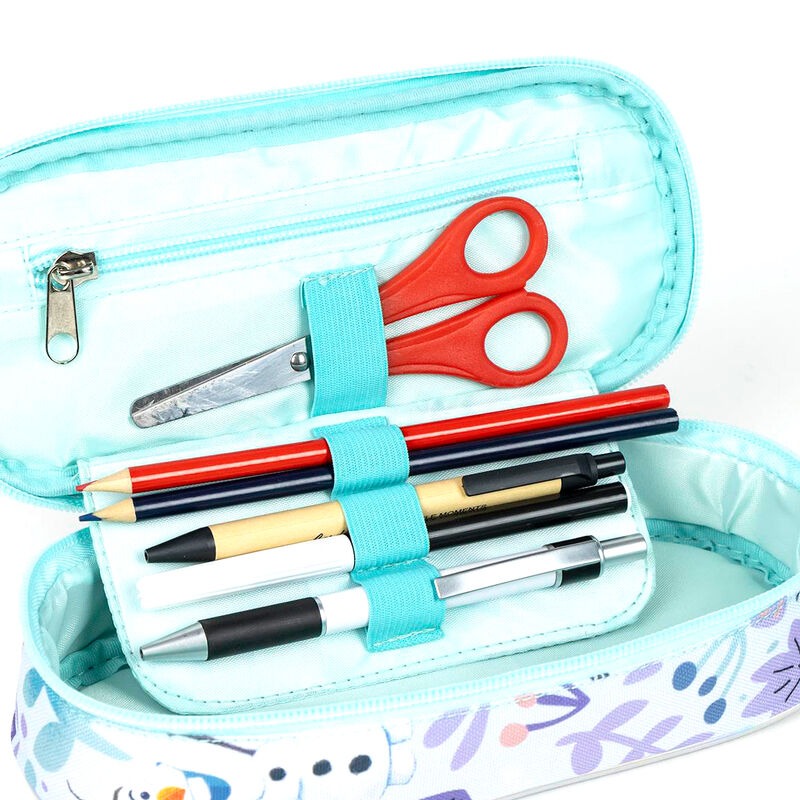 Este Portatodo Frozen Disney es genial para ir a al cole. Con un compartimento principal te permite guardar tus bolígrafos, lápices y otros útiles de forma organizada y práctica. Además tiene un bolsillo pequeño interno y una asa de mano en el lado. El diseño es muy bonito con Elsa rodeada de flores y todo en tonos pastel. Con el tamaño 8,5x5x22,5cm es ideal para llevar en la mochila. Está fabricado en Polyester. Es un producto del fabricante Grupo Cerdà, una marca referente en la fabricación de accesorios y complementos.