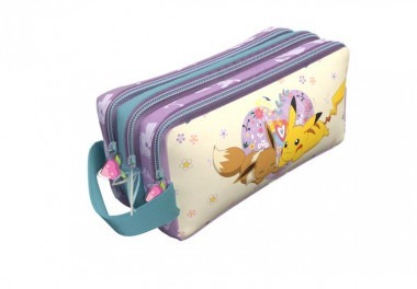 Este Portatodo Pokemon colección Flowers Triple es ideal para cualquier fan de Pokemon. El estuche Flowers de Pokémon es imprescindible para complementar tu mochila escolar en primaria, secundaria o en la universidad. Este amplio portatodo triple con asa es perfecto para llevar ordenado todo tu material escolar. Este estuche triple cuenta con 3 amplios compartimentos. Sus cremalleras metálicas son muy resistentes. Además, está decorado con un panel frontal de cuero sintético diseñado en colores pastel con Eevee y Pikachu y cuenta con un asa para facilitar su transporte. Es un regalo original para peques y para mayores fans de Pokemon.
