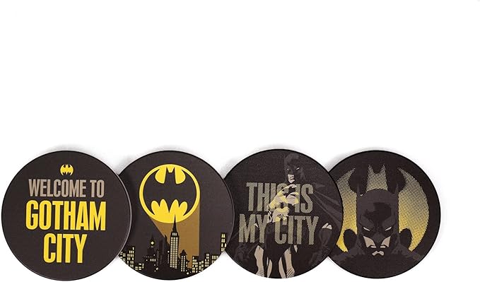 Estos Posavasos Batman Gotham City tienen un diseño espectacular. Están hechos de cerámica que aportan elegancia y resistencia. Y cada uno de ellos tiene un diseño diferente: Uno con Batman y la frase «This is my city», otro con la batseñal, otro con la frase «Welcome to Gotham City» y el último con la cara de Batman y el logo detrás de su figura. Tienen un tamaño de 11×3,5 cm y vienen en una caja regalo. ¡Siéntete como si estuvieras en Gotham con estos posavasos! Estos posavasos con prácticos además de originales, le darás un toque de decoración de DC Comics a tu mesa mientras disfrutas de tu bebida favorita. Puedes ver más productos de Batman aquí.