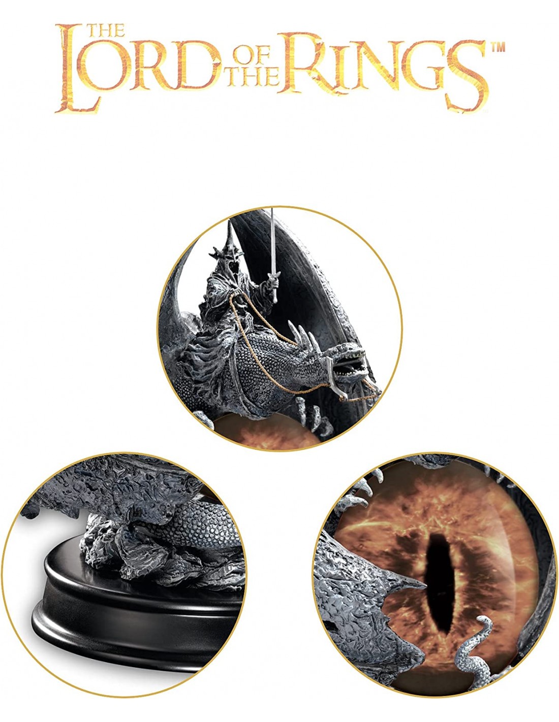 Esta Figura Quemador de Incienso La Furia de Rey Brujo- El señor de los Anillos basada en la saga de El Señor de los Anillos del escritor Tolkien. La escultura engloba una bola de vidrio que representa el ojo de Sauron. El ojo ardiente de Sauron ocupa el centro de la figura. Podemos ver una magnífica escultura que representa al Rey Brujo sobre su terrible montura. El Rey Brujo de Angmar, también conocido como El Señor de los Nazgûl, o simplemente El Rey Brujo, es el líder de los nueve Nazgûl, al servicio de Sauron, y el más poderoso de los nueve. La escultura tiene un quemador de incienso en el que puedes colocar también una vela para que se vea luz por el ojo de Sauron, que es translúcido. La altura aproximada es de 20cm. Puedes ver más productos y regalos originales de El Señor de los anillos aquí.