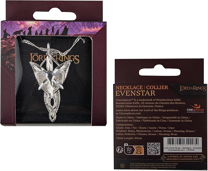 La Estrella del atardecer es una réplica exacta del colgante que lleva Arwen Undómiel en la trilogía de El Señor de los Anillos, una pieza emblemática que simboliza la conexión entre Arwen y Aragorn. Fabricada con todos los detalles, esta Replica El Señor de los Anillos colgante Arwen Evenstar no puede faltar en tu colección. El producto está fabricado con metal y piedras de alta calidad, lo que garantiza su durabilidad y realismo. Además, viene presentado en un elegante estuche que lo protege y realza su valor como objeto de colección. La precisión con la que se ha reproducido este accesorio lo hace ideal para complementar disfraces, realizar sesiones de fotos o simplemente para exhibir en una vitrina. Es una réplica realizada por la marca cinereplicas lo que garantiza su calidad. Puedes ver más productos y regalos originales de El Señor de los anillos aquí.