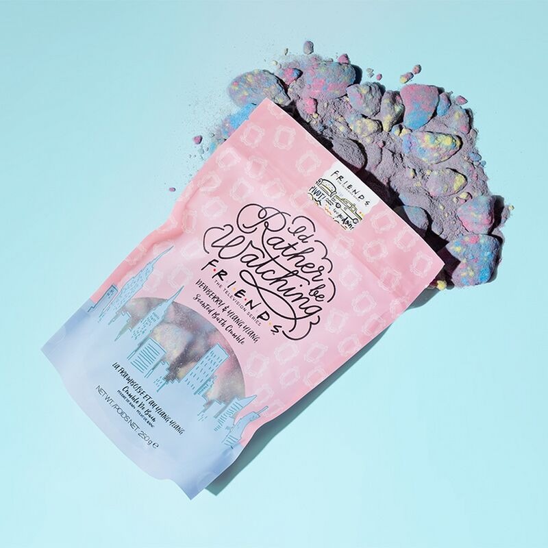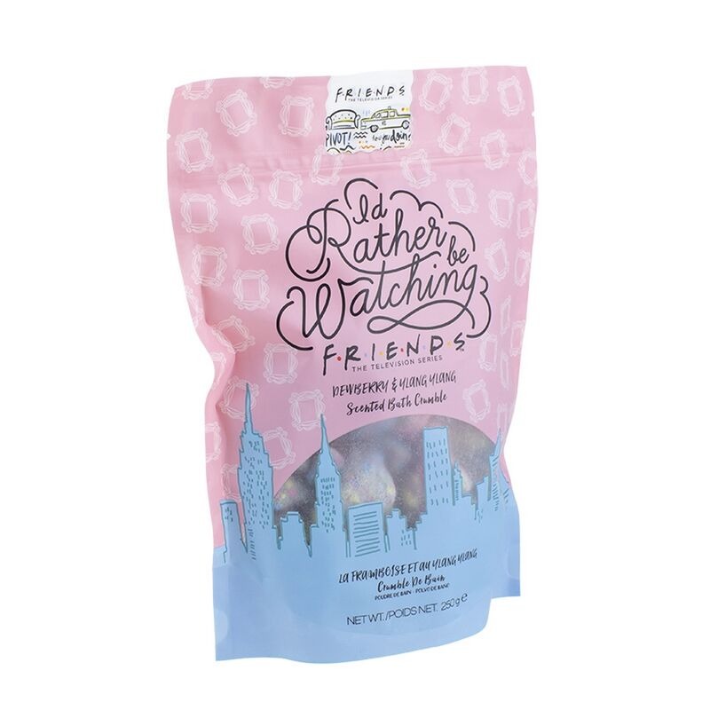 Sales de baño Friends basados en la mítica serie de los 90 con la frase «Preferiría estar viendo Friends». Diseñado teniendo en cuenta la comedia Friends, este baño burbujeante hará sonreír a cualquier fanático del programa. llena tu baño con el aroma relajante de un spa de lujo y siente cómo se va el estrés. Nada mejor como ver tu serie favorita y tomar un baño para tener un momento único de relax. Al verter la mezcla en el agua del baño libera un aroma delicado con matices frutales, el hermoso y dulce aroma de Dewberry e Ylang Ylang Oriental es un maravilloso aroma de baño que estimulará tus sentidos mientras te relajas. Adecuado para todo tipo de piel, el color azul y lila de este baño es tan bonito como efectivo, dejando unos colores pastel en tu baño. Un regalo original que les encantará. Más regalos de Friends aquí.