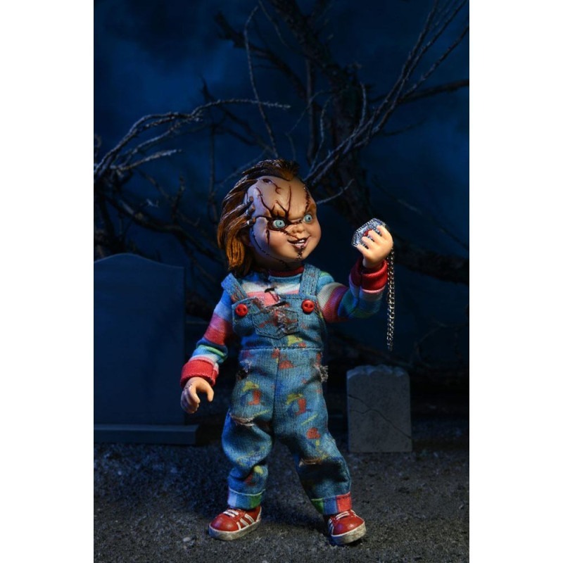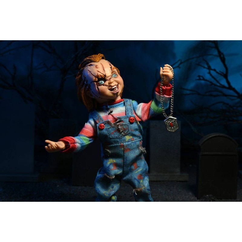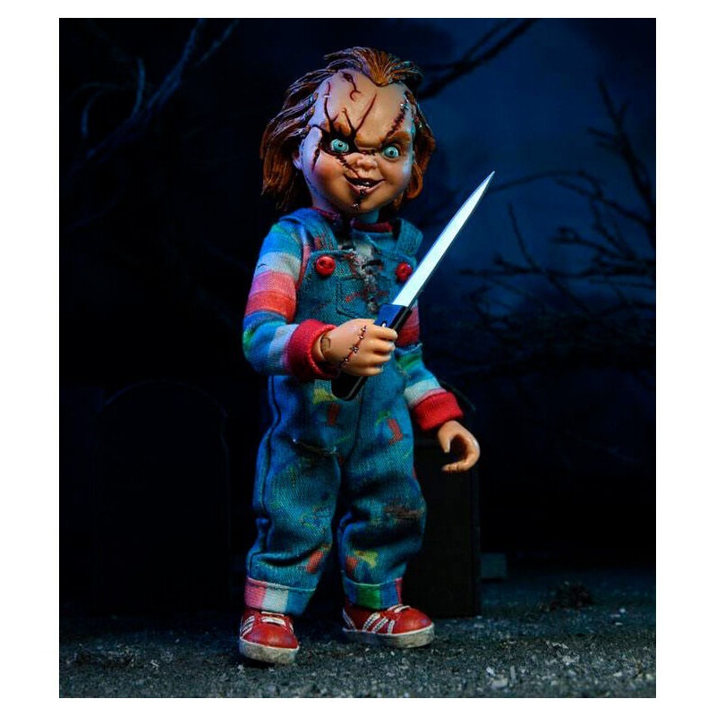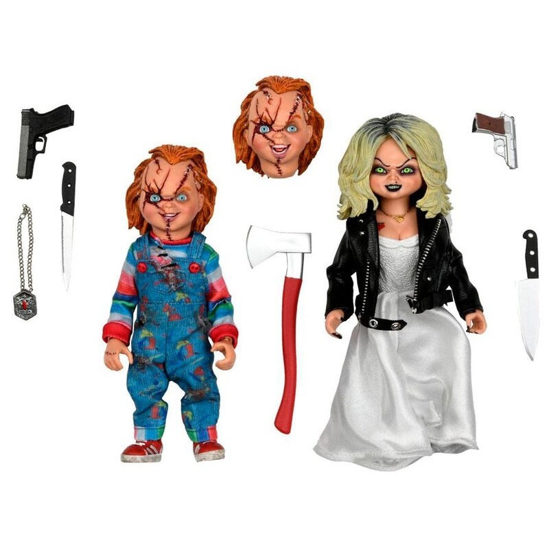 El fabricante de figuras de colección NECA, nos trae este set de dos figuras articuladas de 14 cm, que reproduce a la perfección a la pareja de muñecos más malvados del cine de terror: Chucky y Tiffany, tal y como aparecen en La Novia de Chucky. Estas figuras tienen todos los detalles de los personajes, con mucha calidad reproducen de forma fiel a la pareja, lo que se aprecia especialmente en la expresión, ropa y otros muchos detalles, como los ojos, que parecen realmente ojos de verdad. Además vienen con diversos accesorios: una cabeza intercambiable de Chucky, y unas cuantas armas homicidas: dos cuchillos, un hacha, dos pistolas… Y la ropa es de tela de verdad! Vienen ambas figuras en una caja con ventana diseñada especialmente para ellas, para que puedas regalarla o coleccionarla tranquilamente. Es un set especial para los fanáticos de esta saga de películas y de los coleccionistas de figuras de cine de terror. Si quieres buscar más ideas de regalo o completar tus colecciones en la sección Cine de Terror de nuestra web encontrarás el merchandasing más genial.